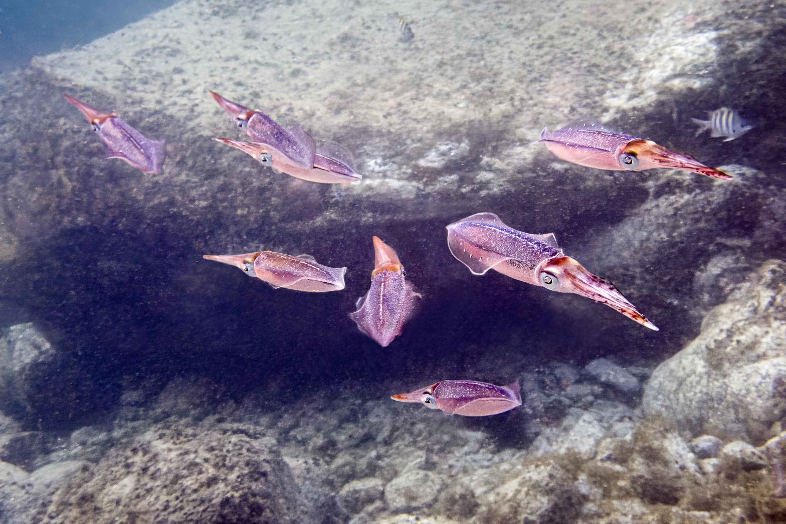 Curious creatures, these luminous swimmers be. Forward and backward, gliding effortlessly with the smoothest of directional shifts, they keep a giant eye focused on the floating human while maintaining a short but cautious distance. Which is stranger? Ten tentacles and undulating fins or a single air-filled glass eye and strap on rubber fins. I suspect each contestant would vote for the other in such a contest.
